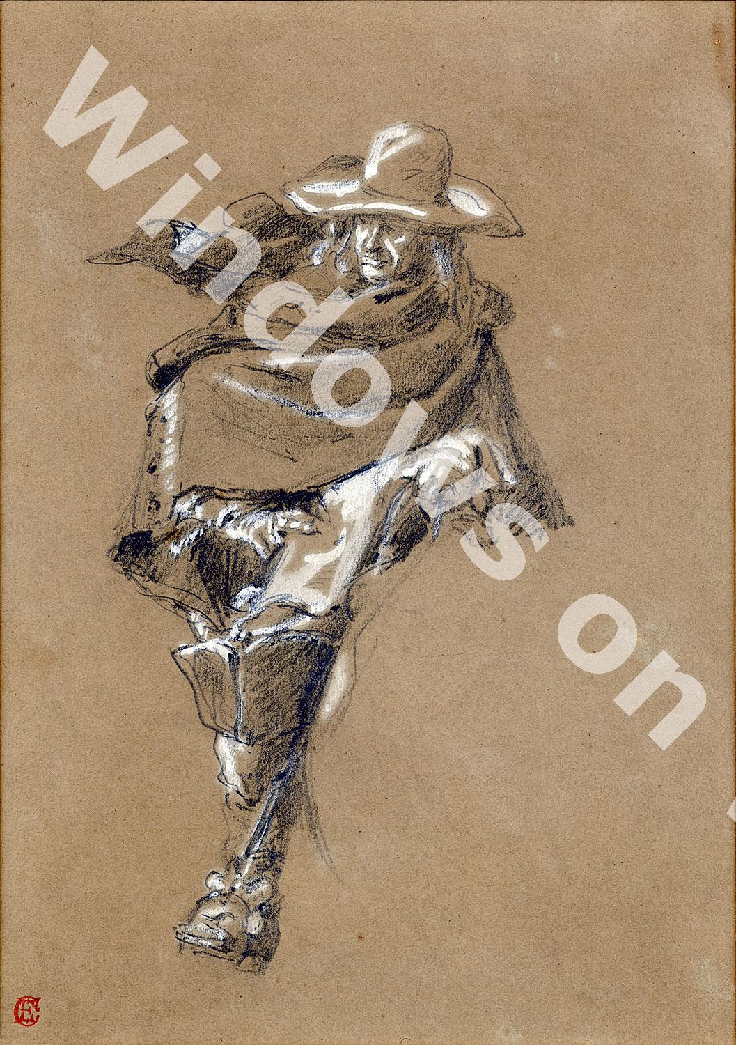 The drawing depicts a man in seventeenth century costume. His foot is in a stirrup, but the rest of the horse has not been drawn.