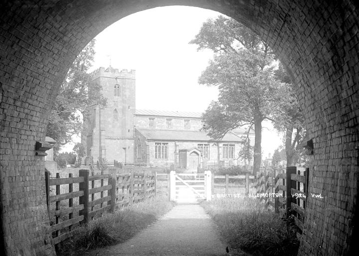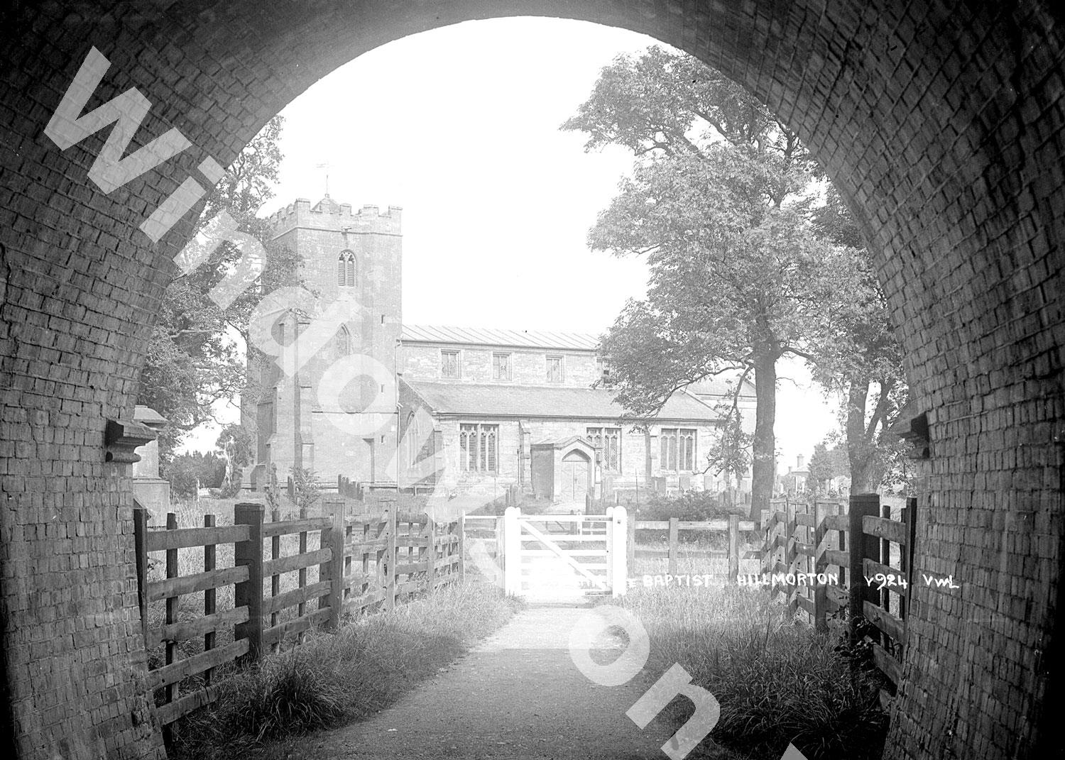 Description:The church of St John the Baptist, Hillmorton, seen through a brick archway. 1930s
