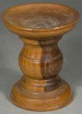 A wooden stand for a pole screen. It has a long shaft and three wooden feet. It also has an acorn finial.